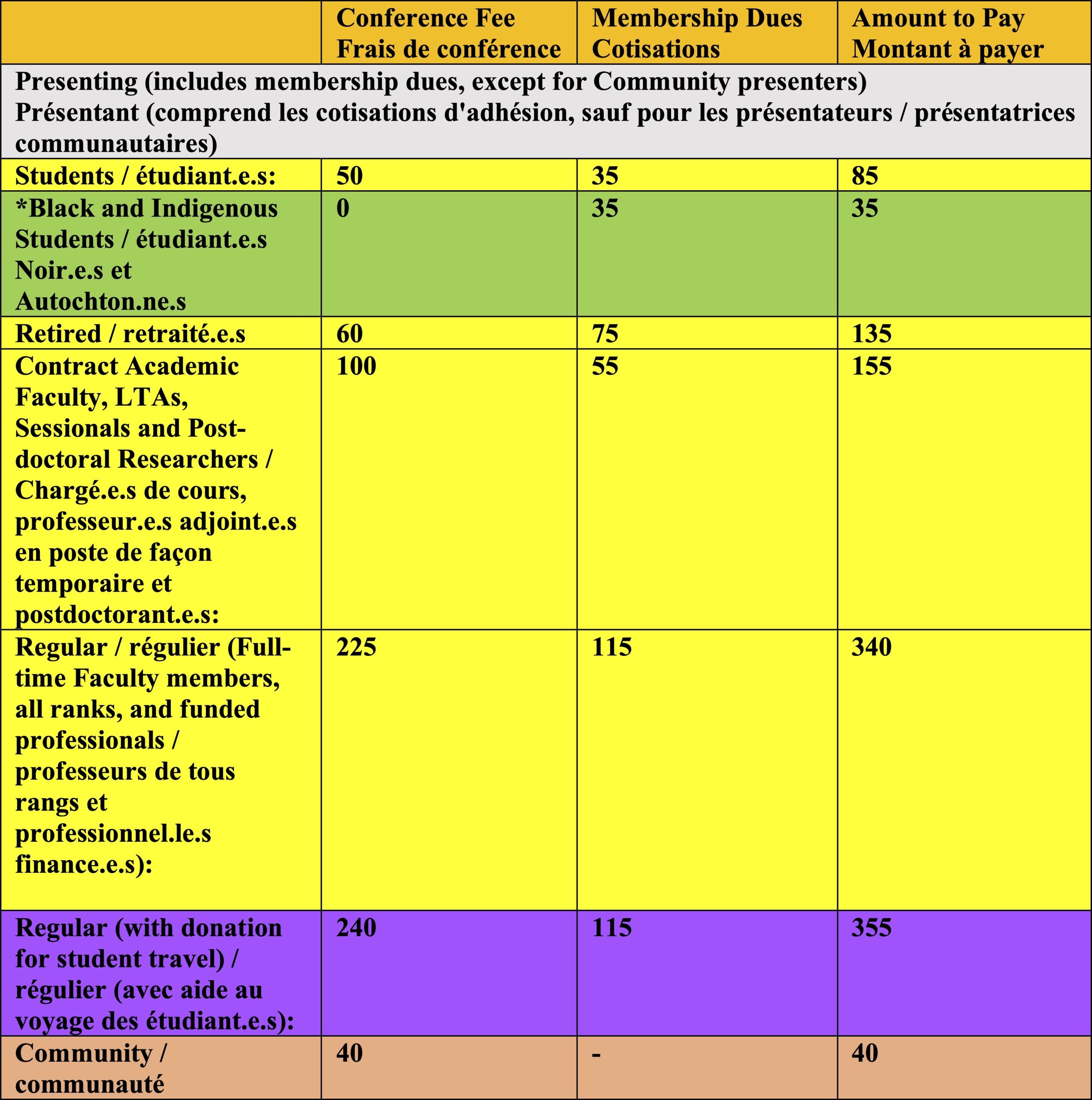 Toute personne inscrite au programme de l’ACC, y compris les co-auteurs, et présentant une communication à la conférence doit s’acquitter des frais d’inscription indiqués dans la catégorie « présentant ». Ces frais comprennent une adhésion d’un an à l’ACC, à l’exception des membres de la communauté non universitaires intervenant lors des tables rondes.